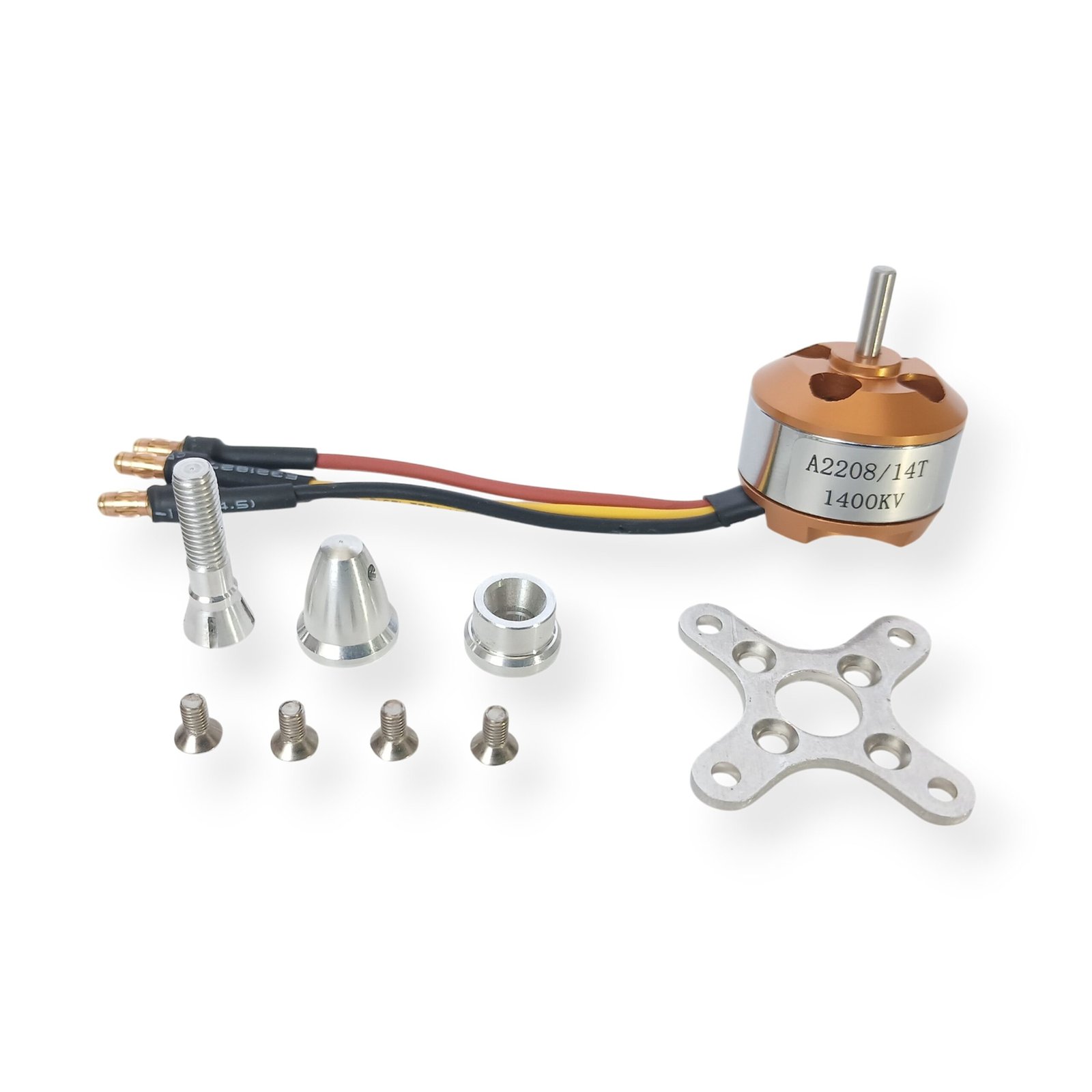 1 x A2208 1400KV Fırçasız Motor 1 x Pervane Aparatı ve Somunu 1 x Motor Montaj Aparatı 4 x Motor Montaj Vidası |