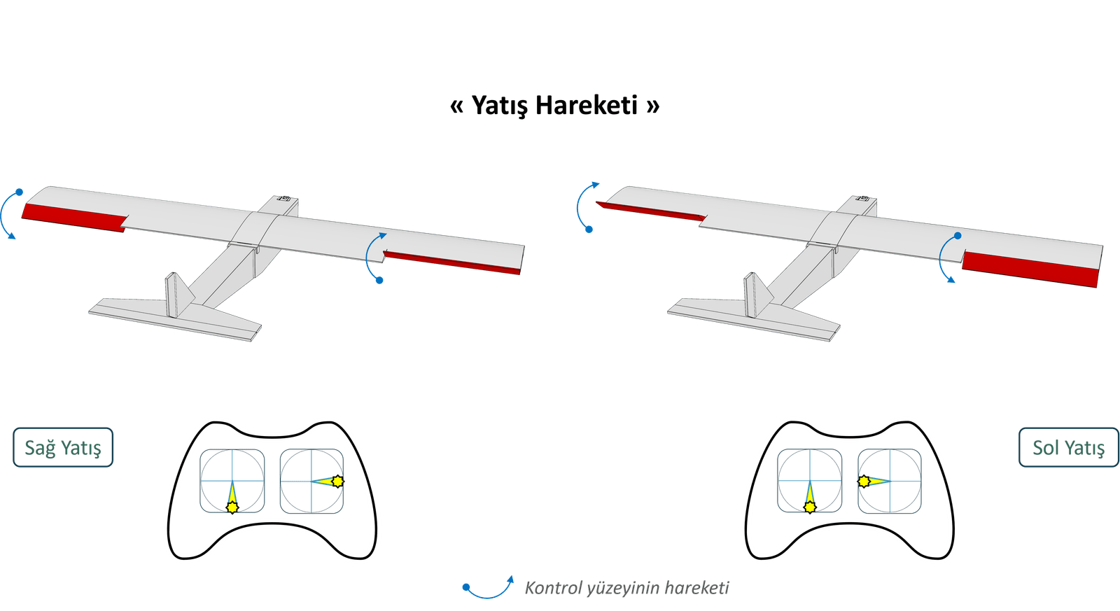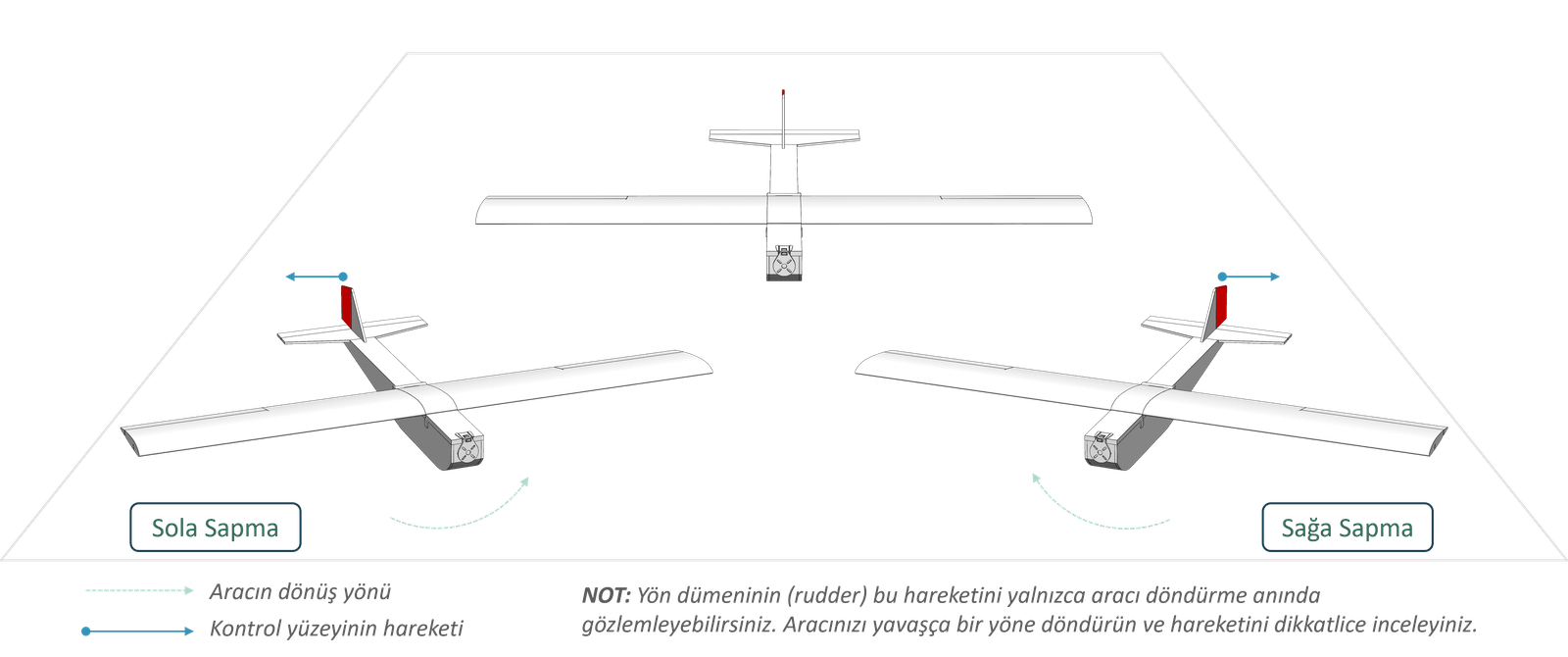 (13) Aracı Denge Moduna alınız. Kumandadan herhangi bir komut vermeden, joystickleri normal pozisyonlarında [a] tutunuz. Ardından, aracı yunuslama, yatış ve sapma eksenlerinde hareket ettirerek kontrol yüzeylerinin aracı dengeleyecek şekilde tepki verip vermediğini kontrol ediniz. Yanlış yönlerde hareket eden eksenlerin etkisini Ters Etki butonunu kullanarak düzeltiniz. Değişiklikleri Kaydet butonu ile kaydettikten sonra, ayarları tekrar kontrol ederek işlemi tamamlayınız.